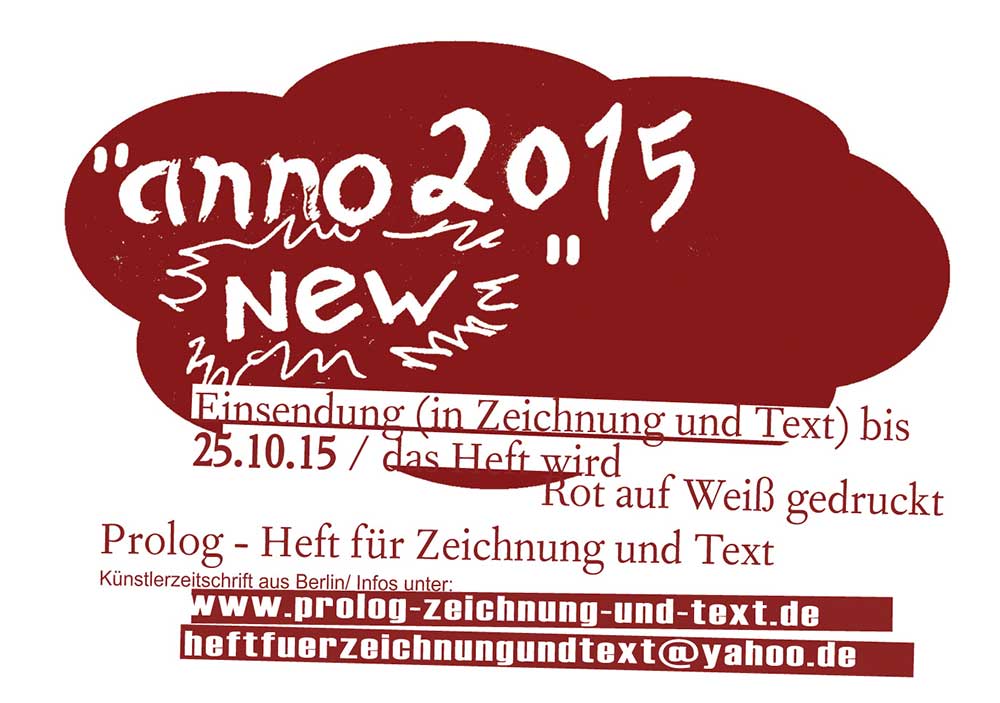 Neue Texte, neue Zeichnungen, was war, was entstand 2015? Mit „anno 2015 new“ will sich Prolog – Heft für Zeichnung und Text dem Neuen widmen. Wer Lust hat, sich mit seiner künstlerischen Arbeit: Entwürfen, Notizen, Skizzen, Ideen, Überlegungen in Zeichnungen und Texten daran zu beteiligen, kann diese für eine mögliche Veröffentlichung einsenden. Und ist auch dazu herzlich eingeladen. Die technische Vorgabe für diese Ausgabe ist, das Heft wird einfarbig Rot auf Weiß gedruckt. Einsendeschluß ist der 25.10.2015. Das Heft soll Ende 2015 erscheinen…